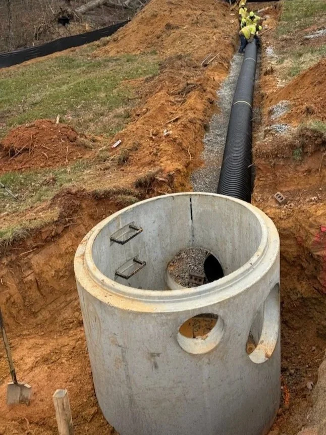 Once the structure is in place, our team completes the pipe tie-ins, making sure each connection is watertight and properly aligned to keep water flowing as intended. After that, we begin controlled backfilling, compacting the soil in layers to protect the structure and prevent future settlement. We finish by setting everything to the proper final grade, ensuring the manhole frame and cover sit exactly where they need to-whether it’s in a roadway, a yard, or a commercial entrance-so it’s safe and accessible for future maintenance.